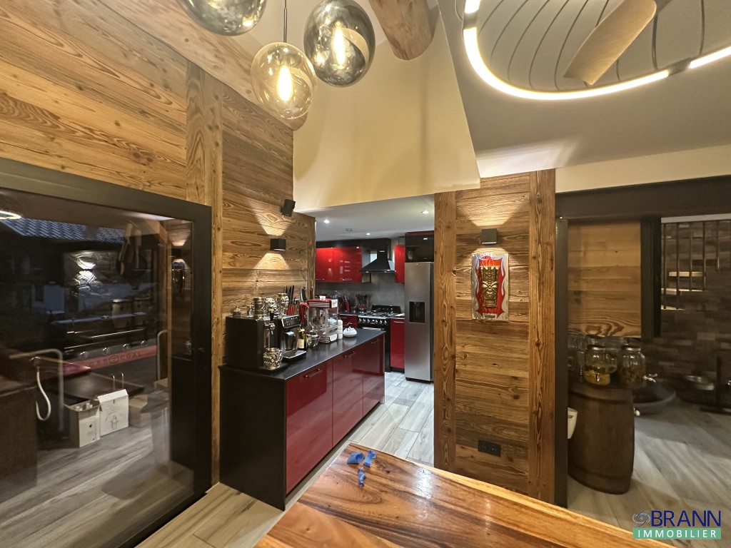 Grande pièce de vie comprenant cuisine équipée, salle à manger et coin salon avec TV.